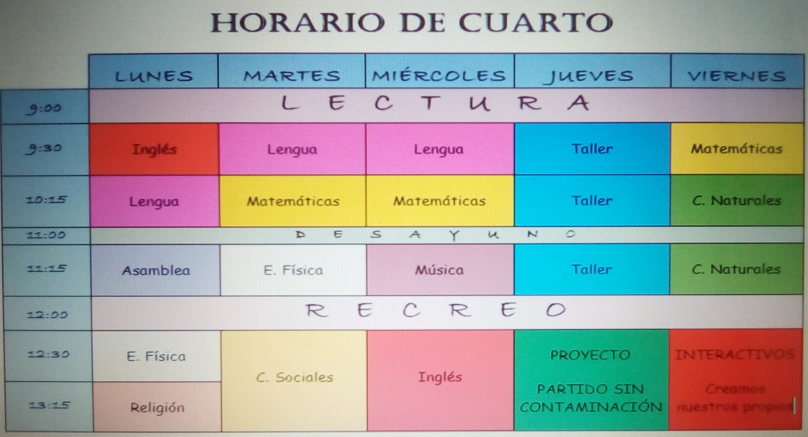 Hola familia, este es el horario que vamos a seguir en 4º cada día recibiréis las propuestas vía WhatsApp